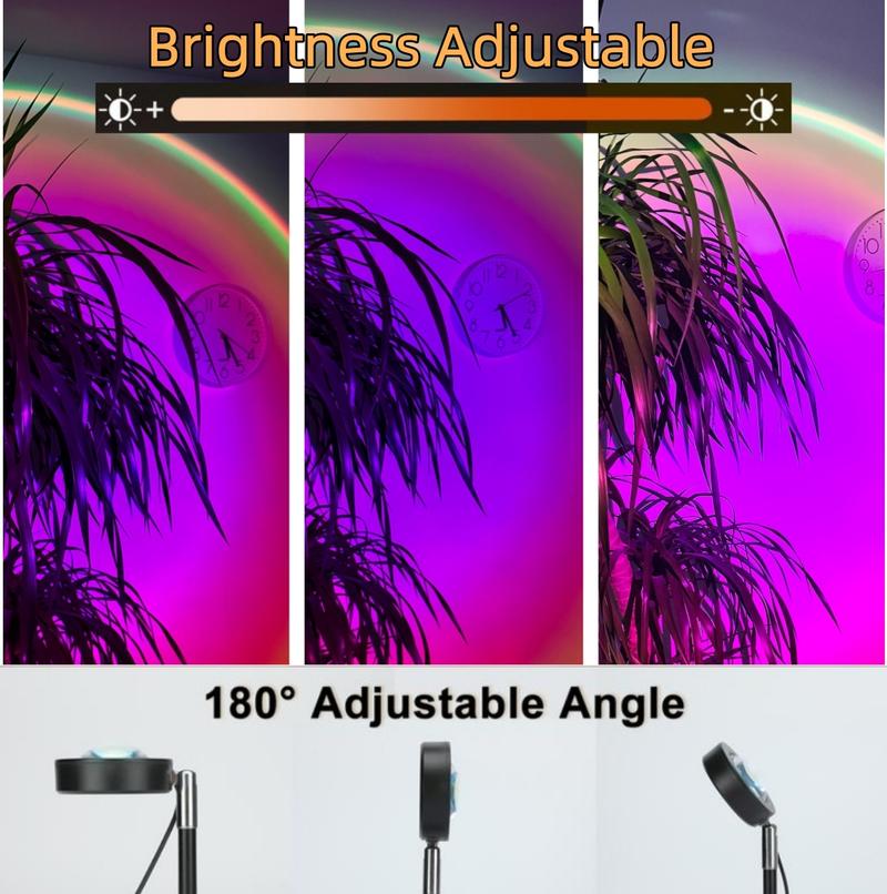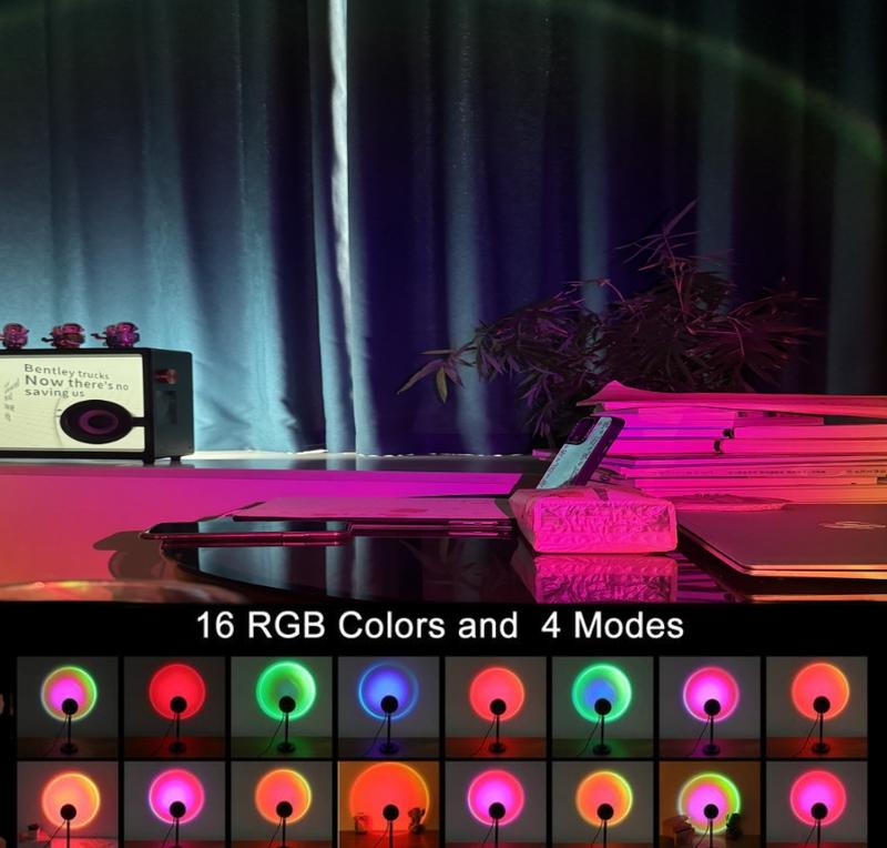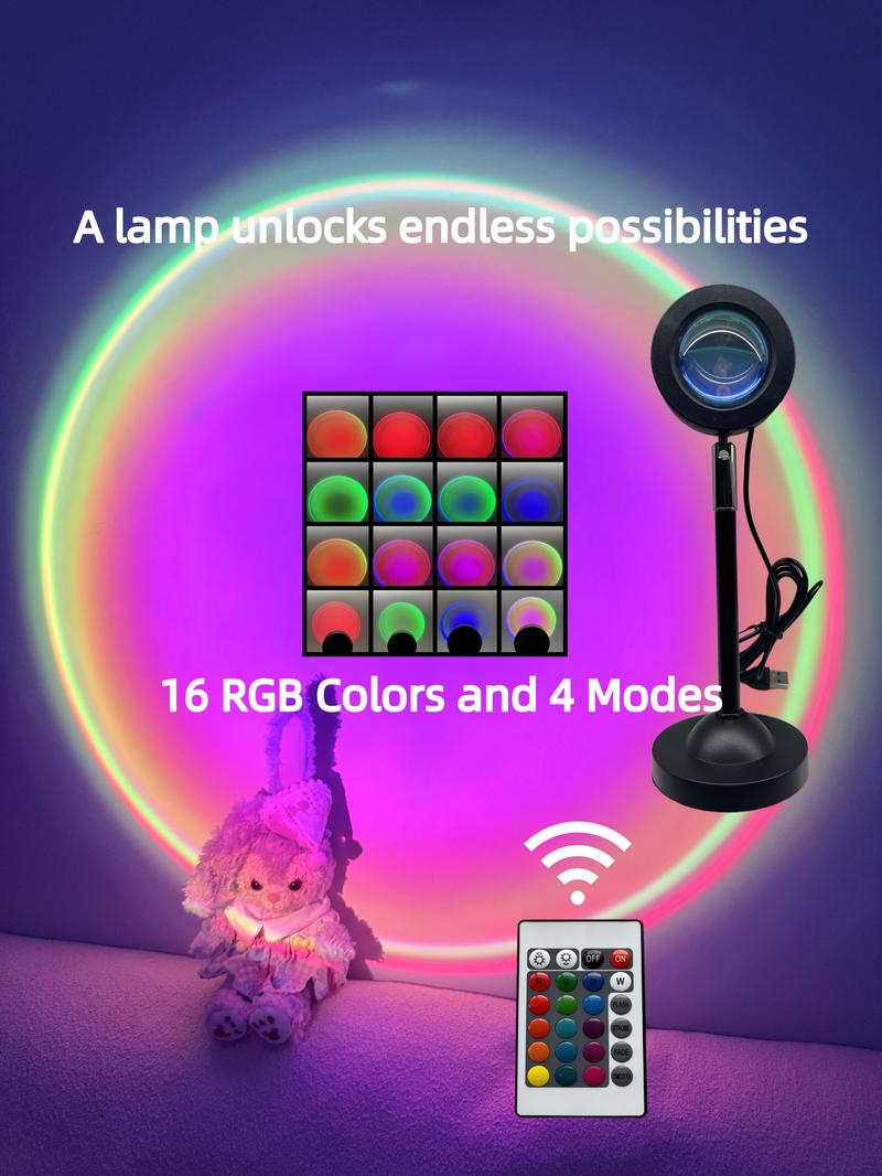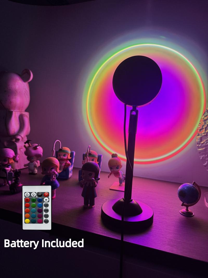 Transform your space with the Fall Sunset Lamp Projector Light! This 180° adjustable RGB mood lamp offers 4 modes for versatile lighting. Perfect for bedrooms, gaming rooms, or live streaming. The remote control ensures easy operation. Batteries are included for immediate use. Ideal as a Christmas gift.